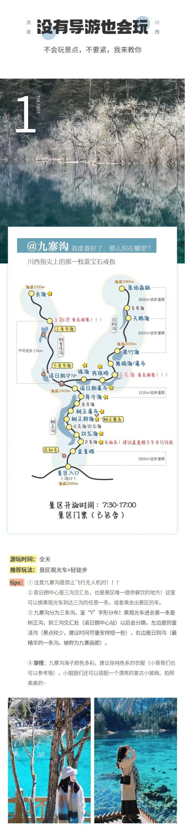 4、九寨溝景區實行分區域開放,開放區域為溝口經諾日朗瀑布至長海,扎如溝的扎如寺及日則溝的鏡海;其中,長海、五彩池、鏡海、諾日朗瀑布、樹正群海、雙龍海瀑布、扎如寺等景觀原則上為步行游覽區,具體游覽方式請聽從隨車講解員安排。