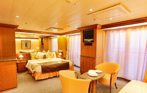 3、船上有一定數量的單人客艙,其價格扣除了一部分關稅。在某些船上有一定數量的雙人客艙,如支付差額,可用于單人。您在預定時,請核對可用性與價格。套房特惠除與所有客艙享有相同的服務和特色外,迷你套房和套房中的游客還享有如下特別優惠:優先登船-仆役服務-每天供應新鮮水果-套房內享用午餐和晚餐(應要求)-極可意浴缸-浴衣和拖鞋-應邀參加船長的高級雞尾酒會-可在點菜餐廳優先預訂席位-可由仆役服務預約觀光活動(命運女神號與維多利亞號上的迷你套房僅有淋浴)。
