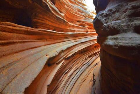 波浪谷是一種紅砂巖地貌,因巖砂上的紋路像波浪,被叫做"TheWave",即波浪。上世紀80年代,人們在美國亞利桑那州和猶他州交界處發現了波浪谷,神奇的外觀和極高的科研價值使其成為了世界八大巖石奇觀之一。而靖邊的波浪谷也有著與美國波浪谷媲美的紅砂巖峽谷。中國靖邊波浪谷和美國波浪谷的差距并不大,都是紅砂巖地貌,靖邊波浪谷更加年輕,只有6000萬年,很多砂土還沒來得及凝固為巖石,地處黃土高原與毛烏素沙漠交匯地帶的靖邊縣龍州鄉。