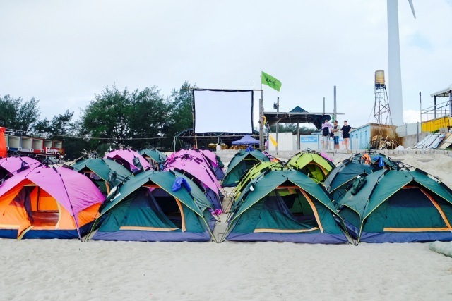 晚上沙灘房車汽車自駕營地里搭帳篷住一晚,在夜里看見滿天繁星。