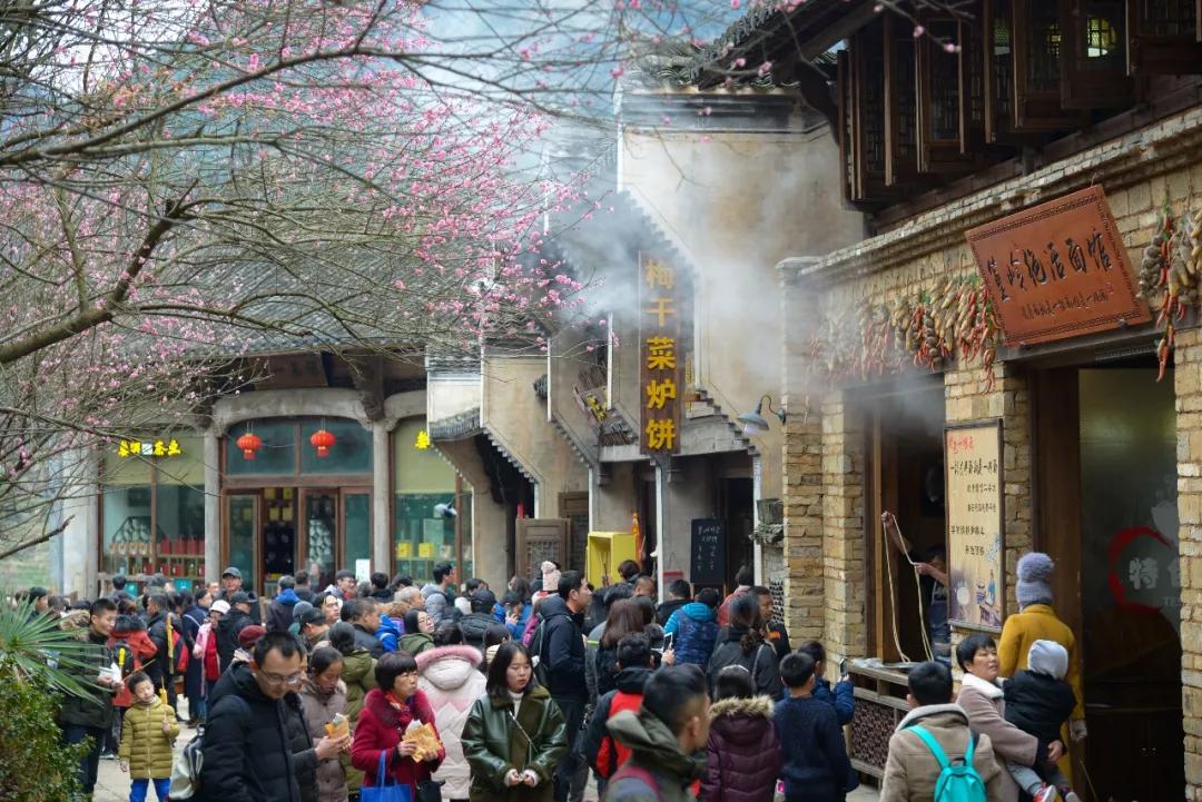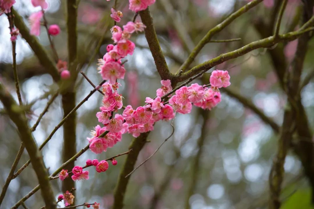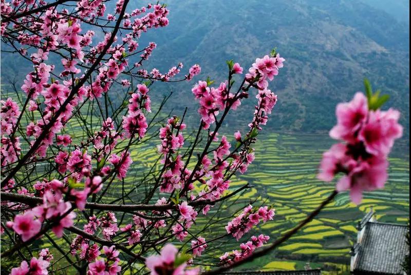 在這油菜花即將盛開的時節,篁嶺的梅花、山茶花早先一步開放,天街道路兩旁,已是粉紅一片。
