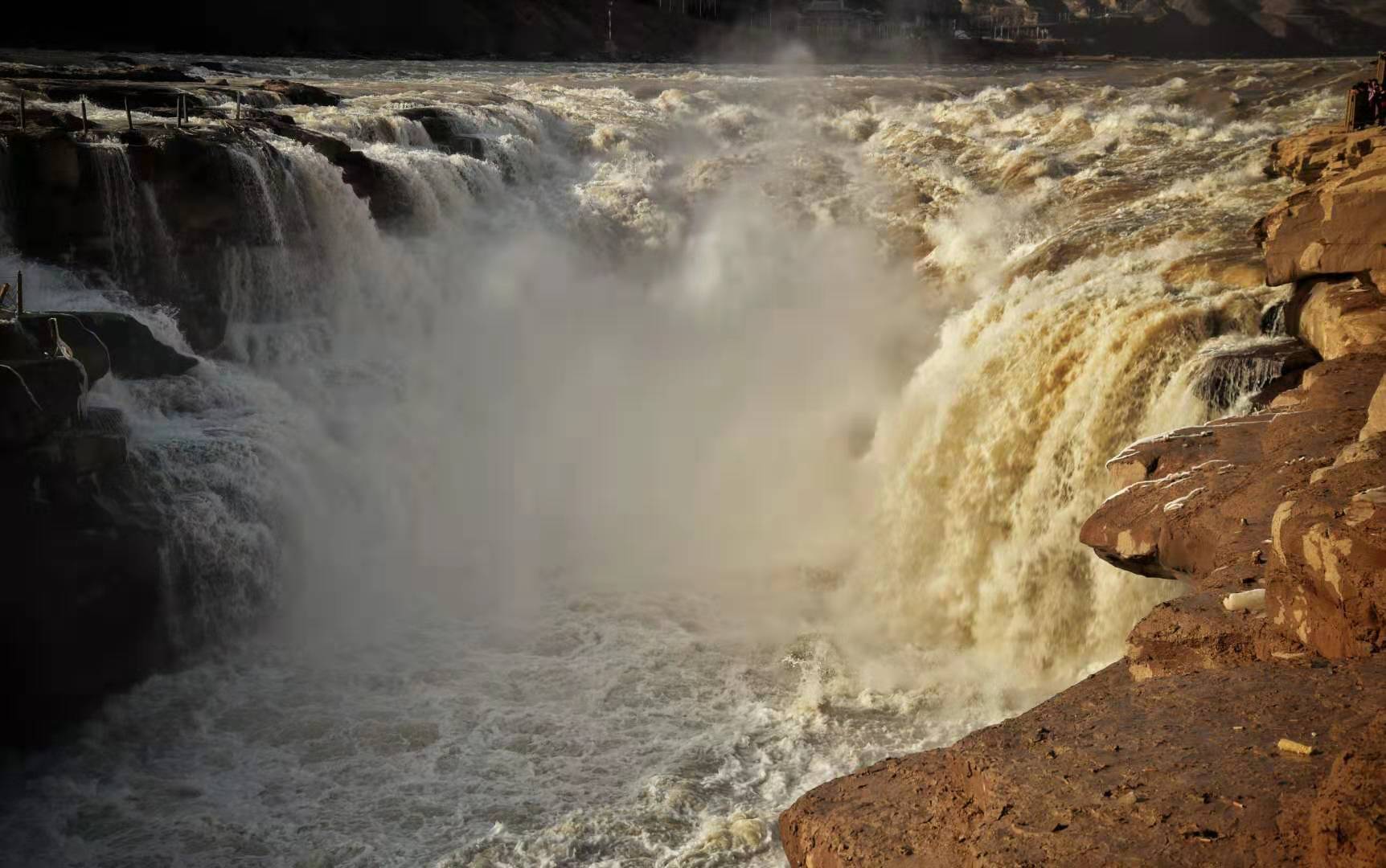 【壺口瀑布】是中國第二大瀑布,世界上最大的黃河瀑布,在水量大的夏季,壺口瀑布氣勢恢宏,而到冬季,整個水面全部冰凍,結出罕見的巨大冰瀑。黃河奔流至此,兩岸石壁峭立,河口收束狹如壺口,故名壺口瀑布。瀑布上游黃河水面寬300米,在不到500米長距離內,被壓縮到20-30米的寬度。1000立方米/秒的河水,從20多米高的陡崖上傾注而瀉,形成”千里黃河一壺收”的氣概。