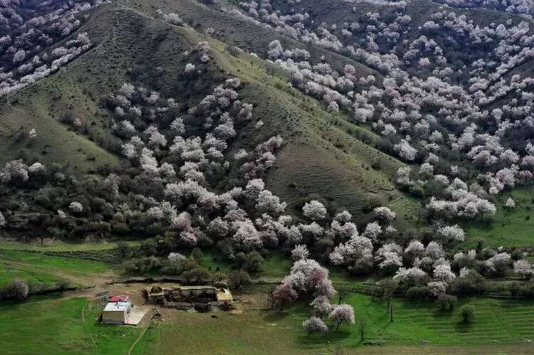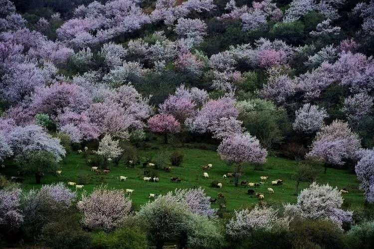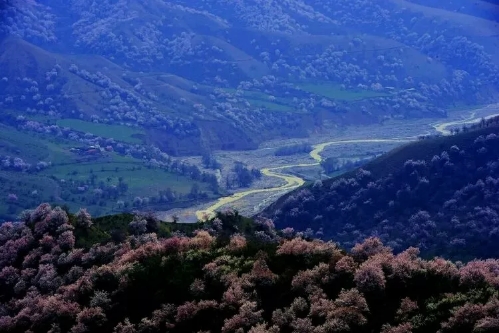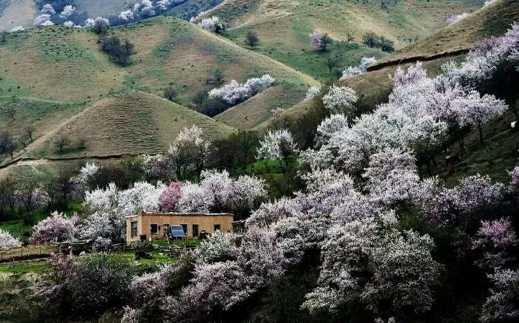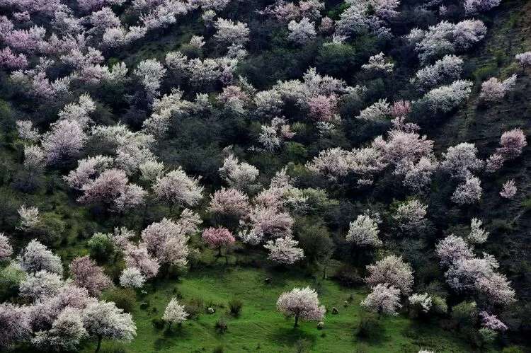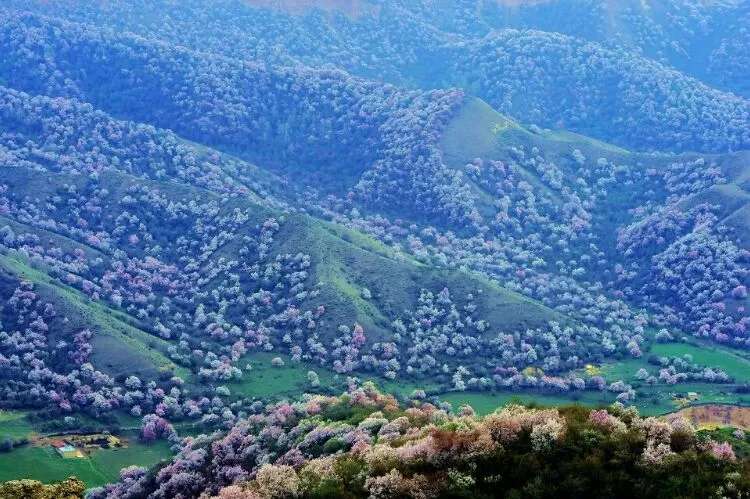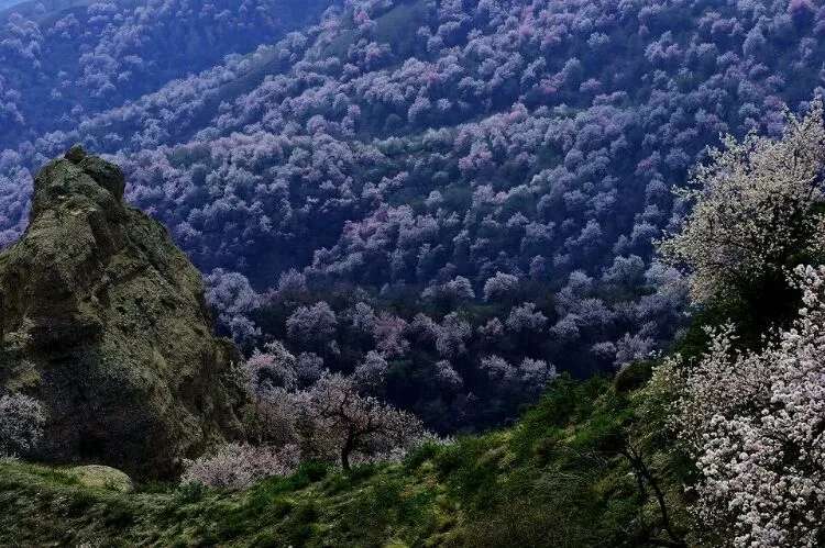 早春三月, 霍城縣大西溝福壽山景區杏花盛開,景色迷人,春花爛漫,香艷滿枝的時候,紅 蘭 粉 紫 白 各色鮮花含苞吐蕊,爭相齊放,滿山遍野,姹紫嫣紅,秋天紅葉鋪滿山腰,碩果掛滿枝頭,碧野在著名的《天山景物記》中記敘這樣的場景:“春天繁花開遍峽谷,秋天果實壓滿山腰,每當花紅果熟,正是鳥雀百獸的樂園”寫的正是大西溝。