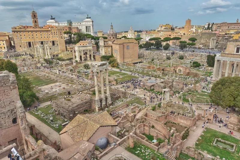 在帕拉蒂尼山上俯瞰羅馬,近處,古羅馬廣場為中心的古跡群曾是帝國最主要的核心區域。
