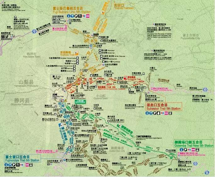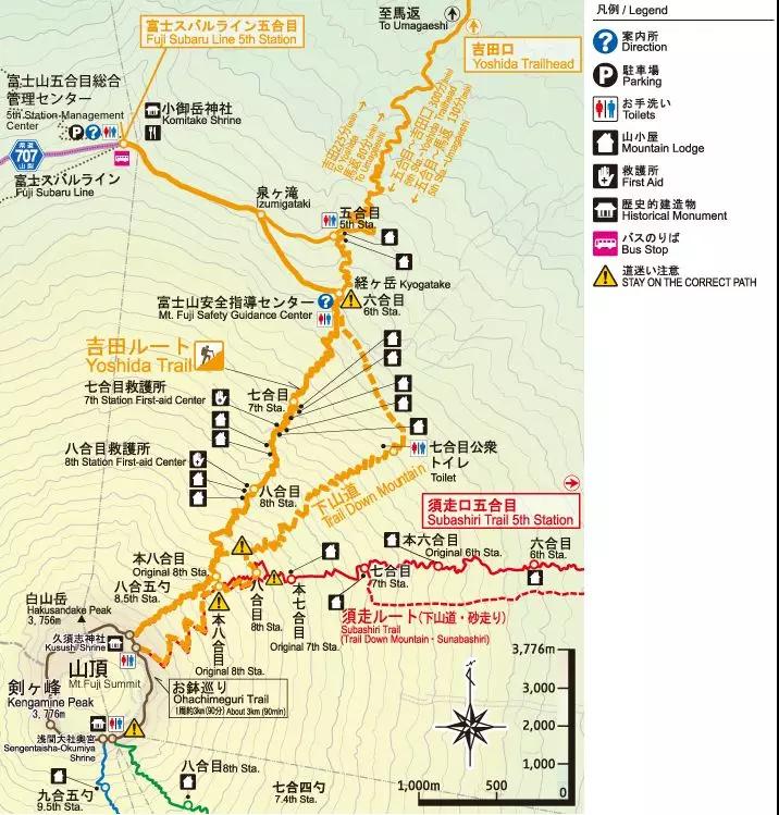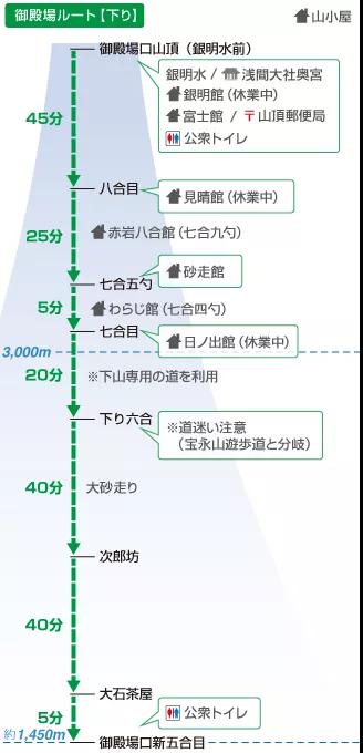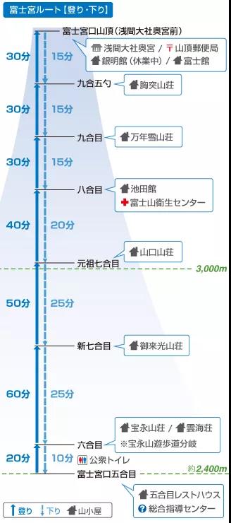 登山道跟下山道除了七合目以上的地方,其余都是不同的。山路上山小屋很少,多位于七合目附近,要自己備好比較充分的水和干糧。除此之外,也沒有救護所。