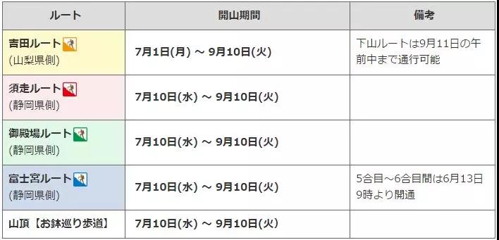 雖然通常都是7月上旬就開放登山道了,但7月初日本梅雨季還未過,所以最好等到梅雨過去的一兩個星期,即7月20日以后攀登為宜。那時候天氣晴朗,是到山頂觀日出的最佳時節。