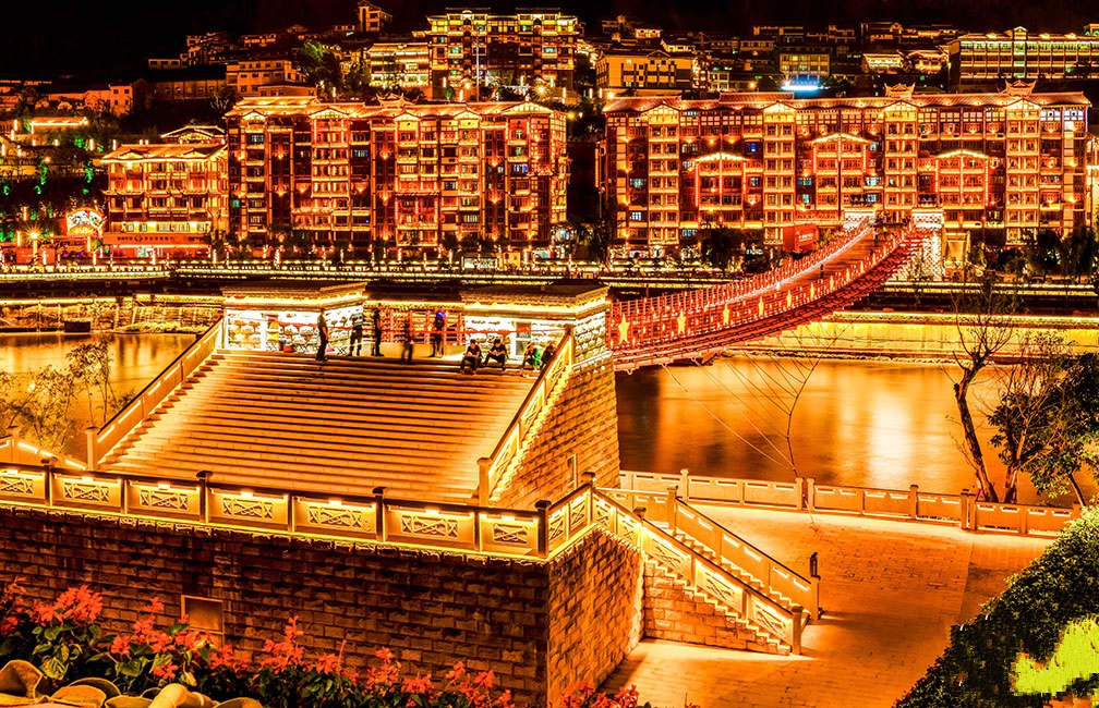 夜幕降臨后,赤水河畔的【茅臺鎮】,風姿韻味無法言語形容,一步一景,步步驚心,美不能再美,赤水河岸邊,房屋上,樹木上,吊橋上,茅臺渡口,到處飄逸燈光彩帶,一層一層向山上蔓延;