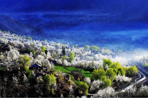 4、前往“中國雪梨之鄉(xiāng)”美譽的金川,萬物復(fù)蘇的初春三月,正值金川成千上萬棵梨樹花期,雪白色的梨花競相開放,一片片、一層層的鋪散開來,漫山遍野的白色花海中夾雜零星新綠,空氣中氤氳著梨花清香,眼是天堂,身亦是天堂。