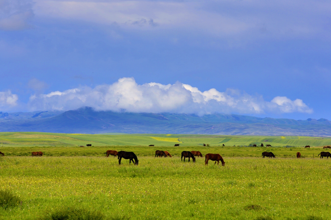當你走進昭蘇草原,就如同走進了一個廣闊的夢境。那泛濫的色彩似乎是對你目光的一次挑逗,黃色的、粉色的、藍色的、紫色的花朵會一直延伸下去再延伸下去。版權所有山東聊城聊之旅國際旅行社有限公司,轉載必究!其悠遠與遼闊的意境,已不是一幅畫和幾句精美的言語所能訴說的,它會在不知不覺間打開你的心境,放逐你的想象。即使你的目光變成一匹野馬,也難以追逐到這些色彩。如果不是那些低垂的云朵、久而不散的彩虹的陪伴,那么你的目光與想象可能會迷失在這無盡的色彩之中。
