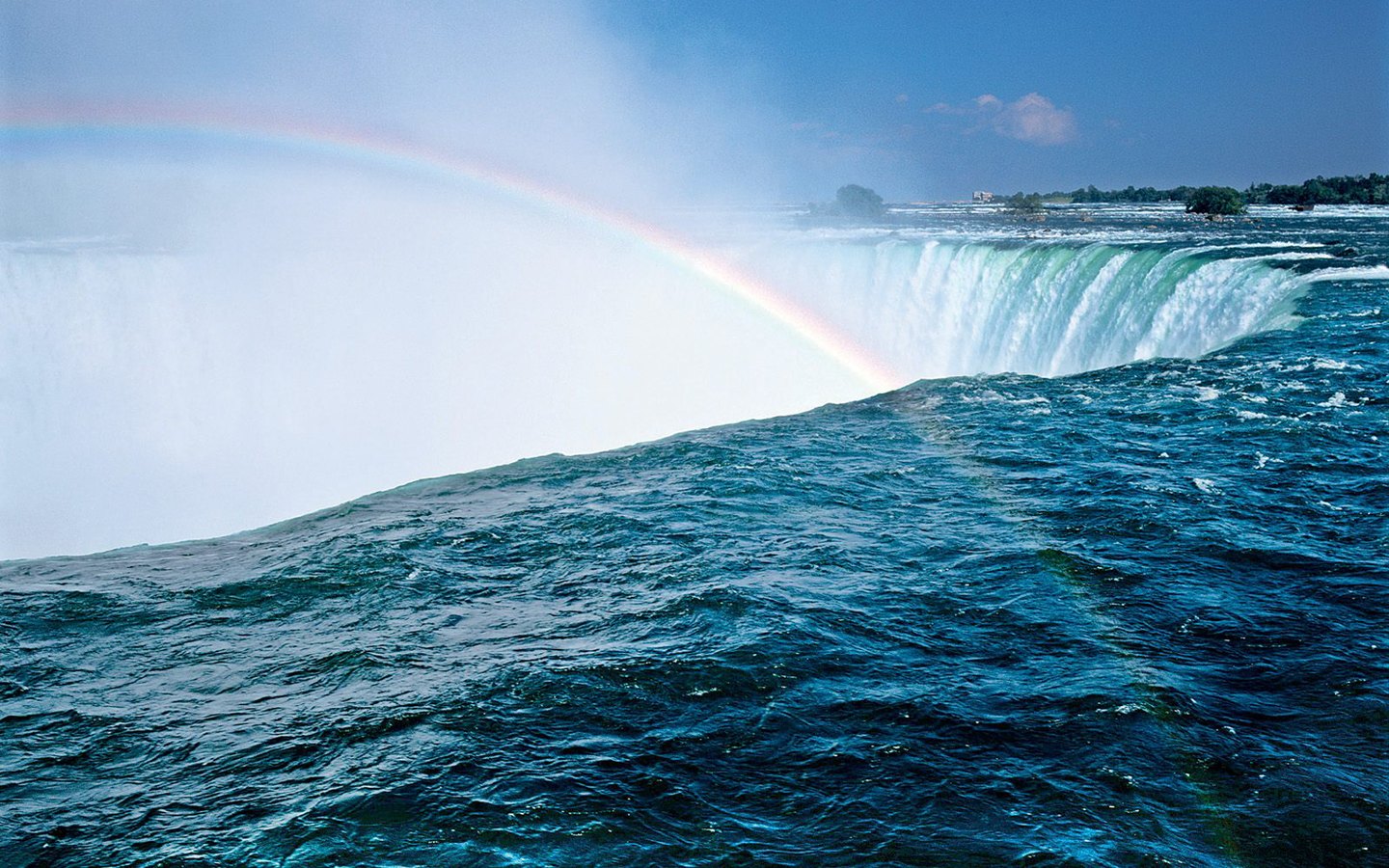 尼亞加拉河橫跨美國紐約州與加拿大安大略省的邊界。是連接伊利湖和安大略湖的一條水道,河流蜿蜒而曲折,南起美國紐約州的布法多,北至加拿大安大略省的楊格鎮,全長僅54公里,海拔卻從174米直降至75米,上游河段河面寬2~3千米,水面落差僅15米,水流也較緩。從距伊利湖北岸32千米起河道變窄,水流加速,在一個90°急轉彎處,河道上橫亙了一道石灰巖構成的斷崖,水量豐富的尼亞加拉河經此,驟然陡落,水勢澎湃,聲震如雷,形成了尼亞加拉瀑布。