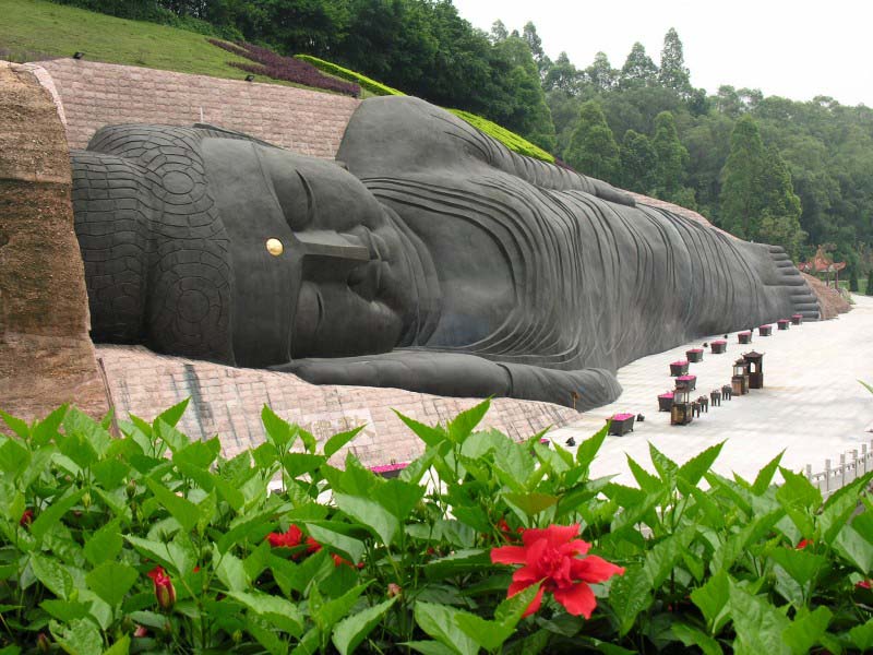 大臥佛位于森林公園天仙巖。相傳當年佛教大師六祖惠能傳教后深夜經過這里,看到天仙巖靈光閃爍,隱約可見這塊橫臥的大石塊就是一個大臥佛,六祖立即跪拜,求佛祖降福天下。大臥佛的雕造從這個傳說獲取靈感,以盛唐敦煌臥佛為范本,佛身長108米,尺度堪稱世界之最?,F經改造用紫銅包裝大臥佛,版權所有山東聊城聊之旅國際旅行社有限公司,轉載必究!成為金裝大臥佛。大佛前面是錦鯉池和荷花池,與大佛相互映襯引人入勝。大佛對岸一層為長六十米的長廊,廊內彩繪佛傳故事,二層為敬佛臺,憑欄對拜,大佛全景一覽無遺。
