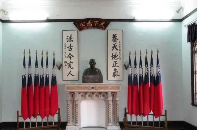 鐵門兩邊原本鑲有中國國民黨黨徽。「一二•三事件」發(fā)生後,當(dāng)時的澳門市行政局在1967年1月2日發(fā)出公告,禁止在澳門懸掛和顯示敵對中華人民共和國的外國旗幟、徽章和標(biāo)志。次日,澳門政府派員到該館拆除鐵門,并以專門訂造的,沒有中國國民黨黨徽圖樣的鐵門取代。不過,展覽館內(nèi)孫中山先生半身像兩旁仍然可以展示中華民國國旗,成為澳門唯一一處可以公開展示中華民國國旗的地方。