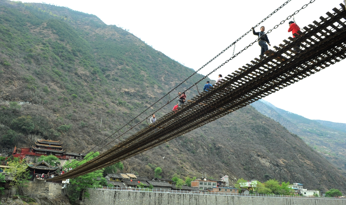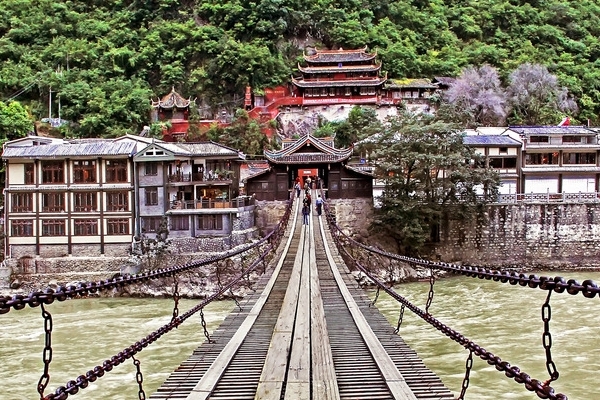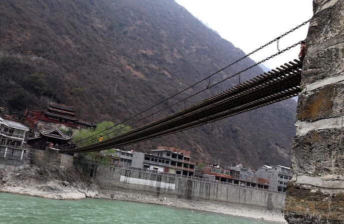 瀘定橋又稱鐵索橋,位于四川省瀘定縣大渡河上,相傳康熙帝統(tǒng)一中國后,為加強(qiáng)川藏地區(qū)的文化經(jīng)濟(jì)交流而御批修建此橋,并在橋頭立御牌。該橋始建于1705年,建成于1706年,是中國古代橋梁建筑的杰作,是國務(wù)院首批公布的全國重點(diǎn)文物保護(hù)單位。 瀘定橋長103米,寬3米,13根鐵鏈固定在兩岸橋臺(tái)落井里,9根作底鏈,4根分兩側(cè)作扶手,共有12164個(gè)鐵環(huán)相扣,全橋鐵件重40余噸。瀘定橋兩岸的橋頭古堡為傳統(tǒng)木結(jié)構(gòu)古建筑,為中國獨(dú)有。