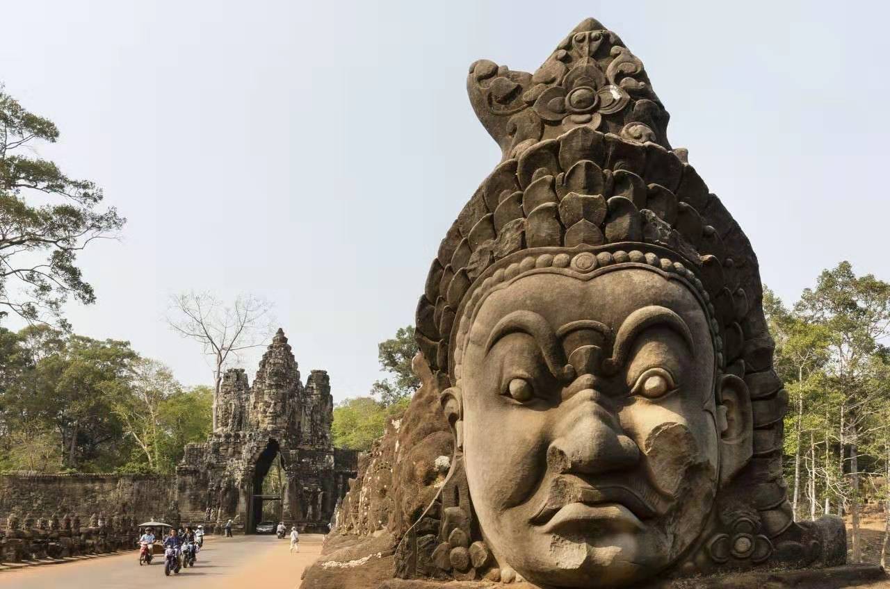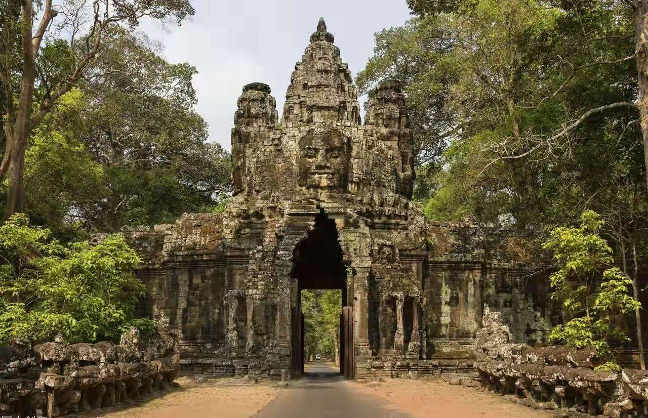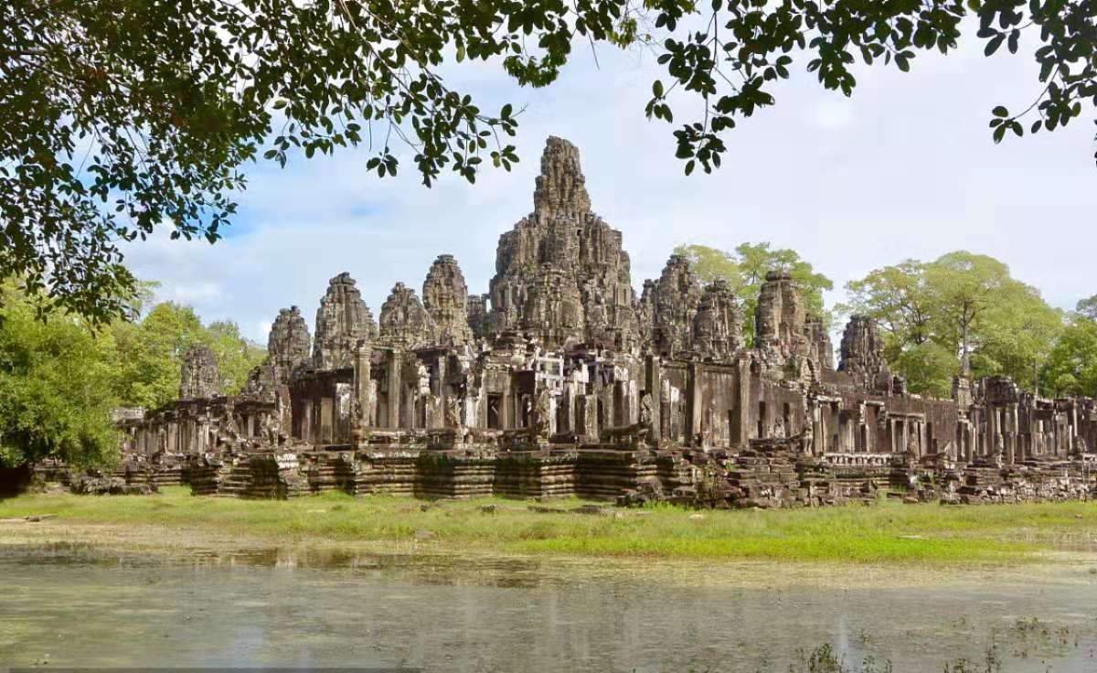 的闍耶跋摩七世驅逐占城人,1181年登基為王,在位三十余年間帝國達至頂盛。他在成為廢墟的首都大興土木,重建吳哥城(Angkor Thom)。鑒于先前被占城入侵的慘痛經驗,闍耶跋摩七世將吳哥城城墻筑得特別高又厚實1,城外建有護城河。城中心的巴戎寺(Bayon), 最著名的就是以闍耶跋摩七世面容為藍本來雕刻的54尊四面佛像,也是“微笑高棉”的由來,寺廟墻上浮雕不只展現闍耶跋摩七世與占城戰斗的壯闊場面,也有描 繪市井小民的生活場景。而因為闍耶跋摩七世篤信佛教,吳哥地區信仰開始由印度教轉變為佛教,在巴戎寺中也可以看到印度教與佛教并存的特殊風格。除此之外, 闍耶跋摩七世還建造了大批寺廟如塔普倫寺(Ta Prohm)、達松將軍廟(Ta Som)等,也興建了不少醫院、旅舍。