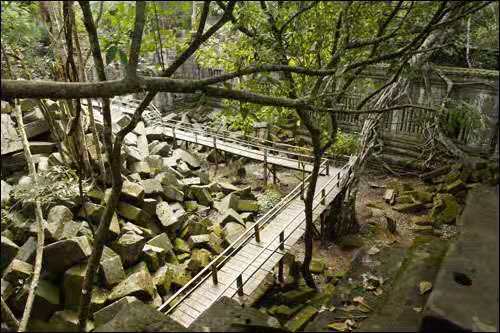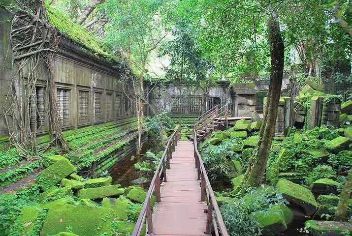 崩密列的護城河長1.2公里,寬0.9公里,它和吳哥寺幾乎一樣大的規(guī)模,但依然被叢林嚴密包裹著。由于比較荒僻,所以很多浮雕和塑像已被掠奪,但寺廟的神秘氣氛仍舊在森林深處彌漫。