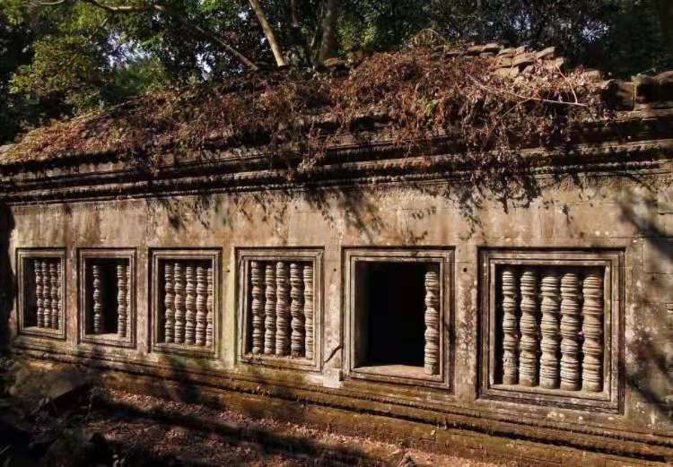 崩密列建于11世紀末到12世紀初,即Suryavarman II時期。這座印度廟宇是用來供奉濕婆神的,是吳哥建筑群第一座完全用沙石建筑的廟。這是一座破敗、隱秘,未經(jīng)修繕的寺廟,這座神廟從來沒有完工,原本應該有浮雕的寺墻上都空空如也。正由于它的原始風貌,有人說這里是吳哥遺跡群中最值得去同時也是最難前往的遺跡。