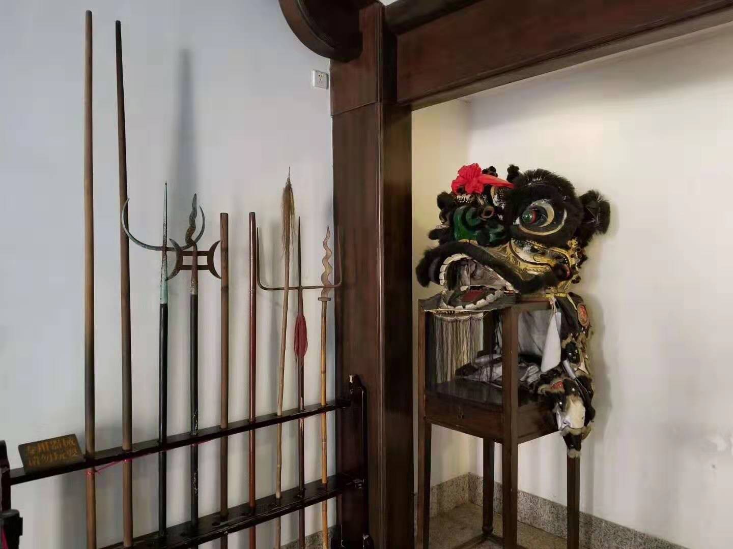 演武廳的木雕大掛落是征集的清代文物,題材是象征富貴吉祥的《牡丹鳳凰》。室內(nèi)窗采用木雕滿洲窗,為滿周窗,以木雕花藤纏繞裝有色玻璃制成,可翻動(dòng),是清代至民國時(shí)期高檔嶺南建筑不可或缺之建筑裝飾。磚雕,正門山墻上嵌兩幅磚雕都是精品,是數(shù)年前修梁園時(shí)征集得來的清代嘉慶時(shí)物,以花鳥為題材,百花盛開,鵲啼雀躍,一派升平氣象。門前一對(duì)石獅子,是清代嘉慶二十三年(1888年)的佛山石雕作品,從祖廟藏珍閣移放黃飛鴻紀(jì)念館作門前獅。