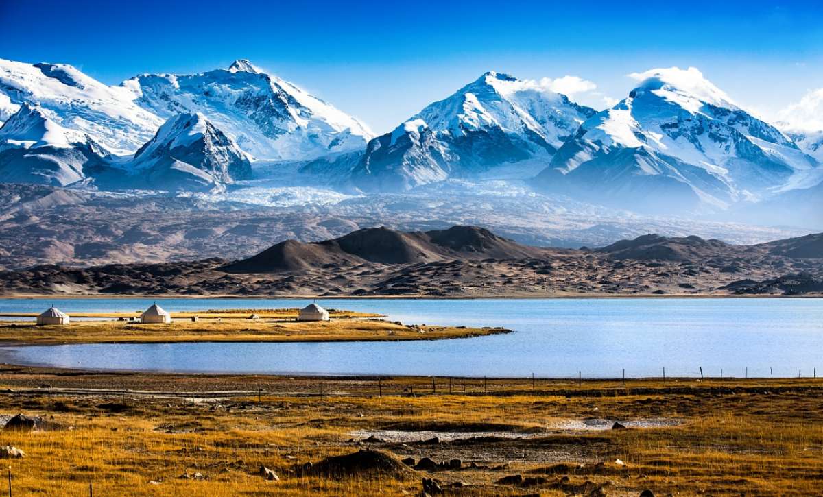 卡拉庫里湖并不是很大,若不是高大的公格爾峰、公格爾九別峰、慕斯塔格峰緊挨著湖邊,卡拉庫里湖著實沒那么出彩。然而有了山就不同了,繞湖一圈,幽藍的山脊倒映在更加幽藍的水面,湖光山色,頗令人有些美好的遐想。湖邊有氈房、木板房可供旅游者下榻,包括新鮮蔬菜在內的風味餐,欣賞帕米爾高原的大好風光。