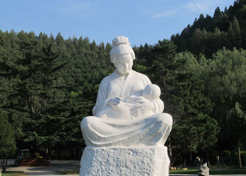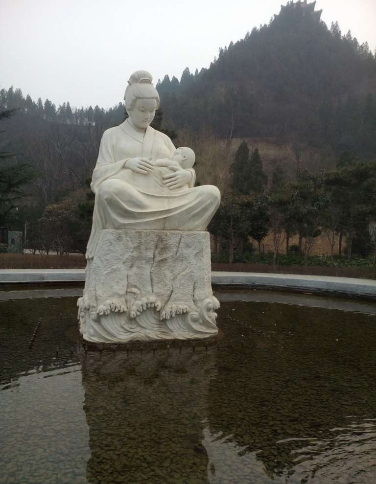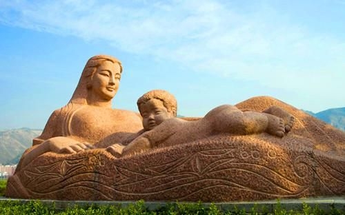 鄭州黃河游覽區的黃河母親像,母親懷抱孩子,做哺乳狀,坐在白玉石之上。母親眼神低垂,愛憐有加,表達了母親對孩子的愛護與垂憐之意。