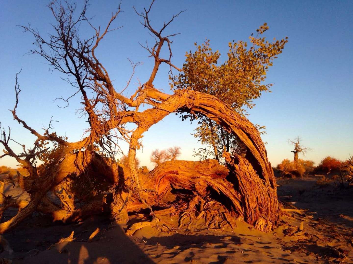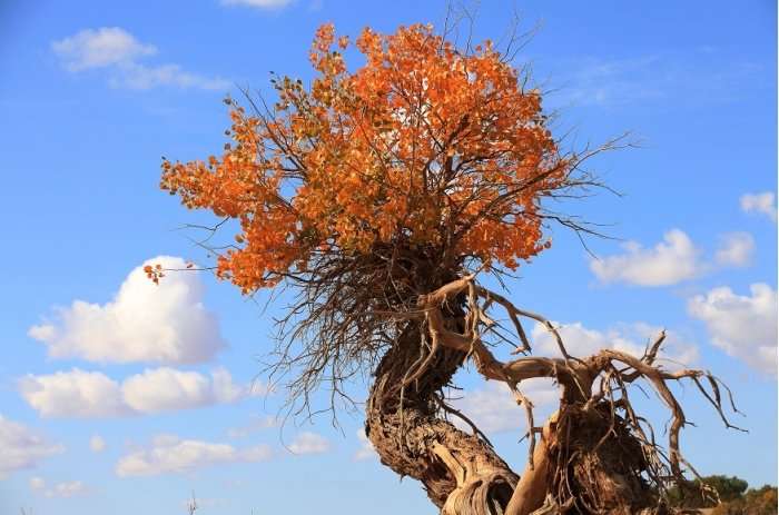 胡楊是樹木中起源最早的類群,被稱之為植物的“活化石”,一棵胡楊的主根,可以穿越地層一百多米,“生而不死一千年,死而不倒一千年,倒而不朽一千年”。