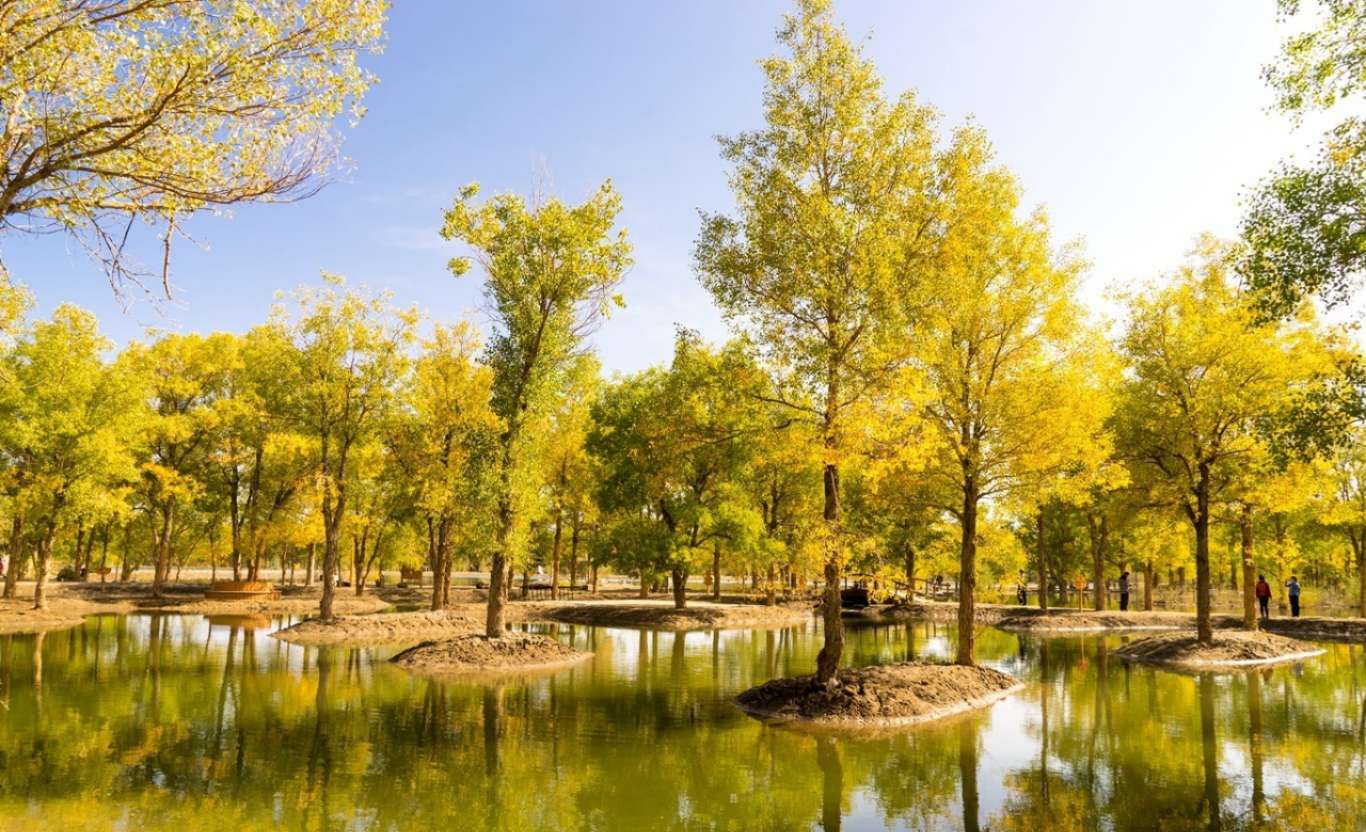 周邊分布大面積的沙棗樹、白楊、紅柳等大西北特有的樹種,該胡楊林分布密集,長勢良好,規模居全省之冠,極具旅游開發價值,不久的將來這里便會更加為人們所熟知。金秋十月的胡楊,綠色的樹葉有的已經變黃,已經變黃的胡楊樹,在湛藍的天空下,在荒蕪的沙漠中如陽光一般明媚燦爛。