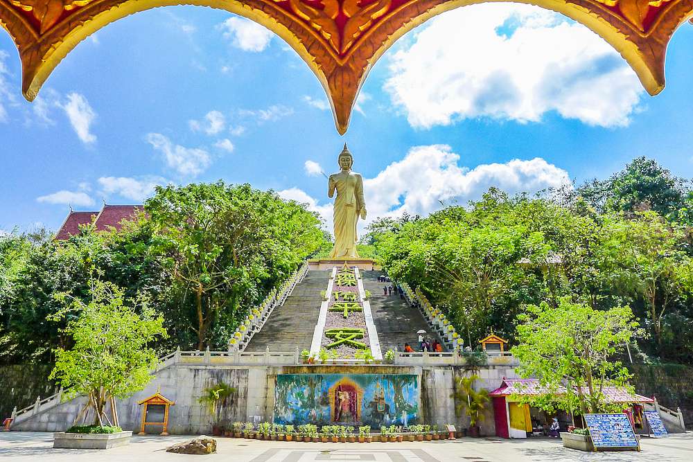 勐泐大佛寺位于云南省西雙版納傣族自治州州府景洪市城郊,按照國家AAAA級景區標準打造。勐泐大佛寺是在古代傣王朝的皇家寺院“景飄佛寺”的原址上恢復重建的,“景飄佛寺”是傣族歷史上一位名叫撥龍的傣王為紀念病故的王妃南紗維扁而修建。王妃一生信奉佛法,所以每逢節日傣王就親臨寺院,舉行大型法會,以紀念愛妃同時弘揚佛法。據史料記載:“景飄佛寺”始建于明代,是南傳佛教象征十二版納的標志性建筑之一,也是版納佛教活動的重要場所。該建筑在佛歷2883年(即公元1848年,清咸豐年間)戰爭中被毀,距今已有169年。佛寺于2005年開始重建,于同年3月9日舉行了大型的土地開光儀式,于2005年5月9日舉行了盛大的大殿奠基開光儀式,在大殿施工時,挖掘出大量的銀幣、銀盒、佛教法事用品等。佛寺于2007年11月3日一期工程竣工,竣工之時,邀請了海內外108位高僧為佛寺舉行了盛大的開光大典,州內外參加開光大典的各民族佛教信眾達65萬人之多。 占地面積400畝,佛寺依山而建,落差達122.8米,呈坐佛形,為國內外所獨有。景區以佛祖釋迦牟尼的生平及佛寺活動為主線,巧妙融入到景觀及建筑群體中,充分展示南傳佛教的歷史與傳統文化色彩。從萬佛塔前廣場俯視景洪市區,旖旎的熱帶風光盡收眼底。
