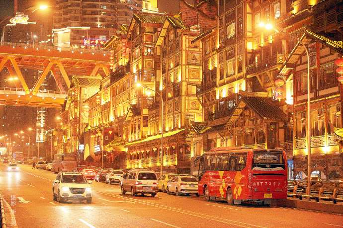 吊腳樓群,洪崖洞絕壁懸崖上的“吊腳樓群”,是獨特的巴渝傳統建筑。重慶洪崖洞民俗風貌區就是這一城市旅游景觀的真實寫照。因水而生、順崖而長,高低錯落、依山就勢,讓重慶解放碑步行街直達江濱,被譽為新重慶的“城市名片”。