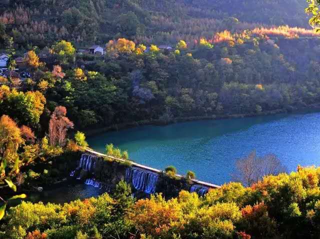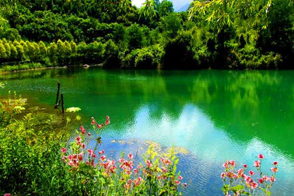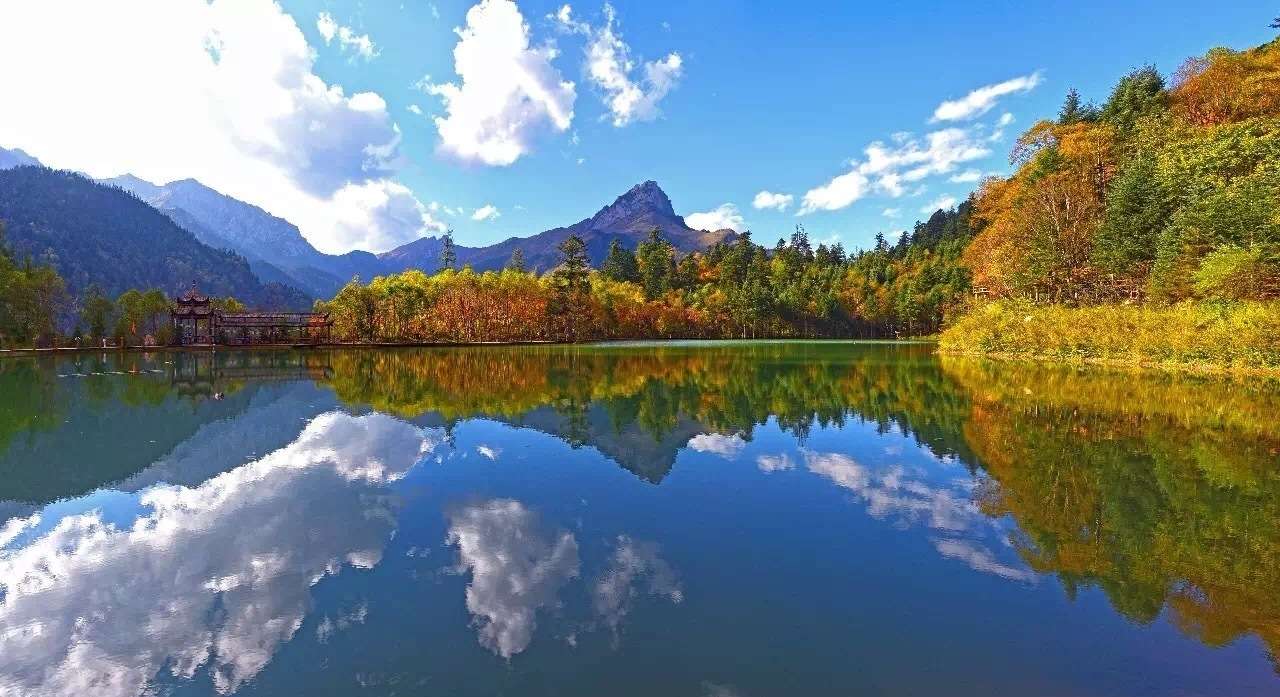官鵝溝水美。13個(gè)大小不等、形態(tài)各異的湖泊,尤如一串綠色的珍珠鑲嵌在溝內(nèi),湖水清澈透底,隨湖底地貌高低呈不同顏色,那些倒映在湖中的古樹(shù)象一條條巨龍臥在湖底。藍(lán)天白云和青山古樹(shù),映入湖中,使天地渾然一體,沒(méi)有界限。