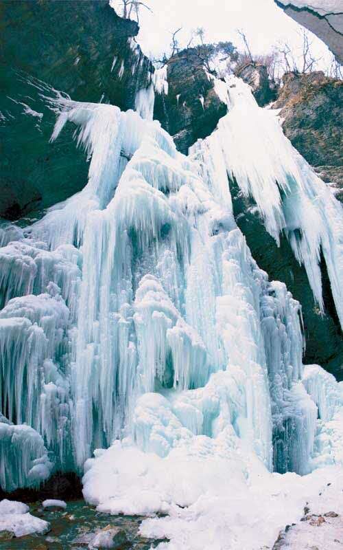 尊敬的游客朋友,剛才我們欣賞了蔚然壯觀的石壁天河,馬上就要看到風(fēng)韻萬(wàn)千的白石山了。峰回路轉(zhuǎn),一道瀑流忽然從天而降,猶如一條銀龍從空中飛下,悠悠忽忽,晃晃蕩蕩,神態(tài)瀟灑自如。細(xì)看這條瀑布,它是從幾十丈高的山崖頂上落下的,自古只有水往低處流,而這里的山崖兩側(cè)溝內(nèi)無(wú)水,崖頂卻有瀑布,真是“水往高處流”。隨河風(fēng)輕拂,它飄飄灑灑,飄逸而矯健,給人以無(wú)限聯(lián)想,“飛流直下三千尺,凝似銀河落九天”正是它的傳神寫照。潔白的瀑流擊在棱角突兀的巖石上,濺起串串晶瑩的珍珠,向四面八方飛散而去。道道涓涓細(xì)流,化成條條白龍,從巖石的四周蜿蜒游去。在官鵝溝眾多的瀑布中,九天飛瀑以它的凌空飛瀉,瀟灑自如而獨(dú)樹(shù)一幟。