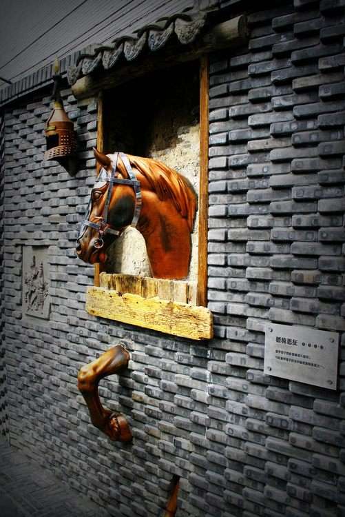 離地約1.2米。已風化斑駁,是寬窄巷子僅存的三個拴馬石之一。百年前這里曾是北方滿蒙八旗及家屬的居住地,有騎馬出行的習慣。拴馬石是北方文化在川西的符號性表現。《磚》文化景觀墻是井巷子中一條400米長的東西走向的雕塑墻,是中國第一個以磚為載體的博物館,一塊塊不同歷史斷面的舊磚,經過藝術的創作,壘砌成臺、城、壁、道、碑、門等成都的歷史文化片段,闡述著千年成都,演繹了百年歷史。文化墻的西段,從“寶墩遺城、金沙竹泥”到“羊子土坯、秦筑城廓”,再從“漢磚遺風、唐建羅城”到“宋磚古道、明末毀城”。展示了成都的滄桑歷史。