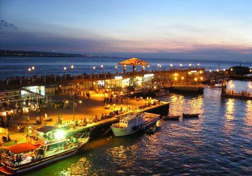 淡水漁人碼頭原只是一個傳統的小漁港,如今,漁人碼頭不但擁有一座美輪美奐的浮動碼頭,其中漁人碼頭最著名的景點,就是330多公尺的木棧道、堤岸咖啡和超大的港區公園,版權所有山東聊城聊之旅國際旅行社有限公司,轉載必究!構成一個環狀動線,讓人們可以完整流暢的體驗漁港風情,站在步道遠眺對面的觀音山和出海口盡頭的臺灣海峽,看著夕陽從水平面上緩緩落下,美景之盛,令人流連忘返。