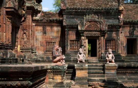 女皇宮采用高棉特有的紅土建造,色彩極為艷麗。含有大量水分的紅土既便于運輸、建筑,也利于雕刻復雜細膩的圖案。而建筑建成后,經過風干,就變得異常堅硬,千年不壞。