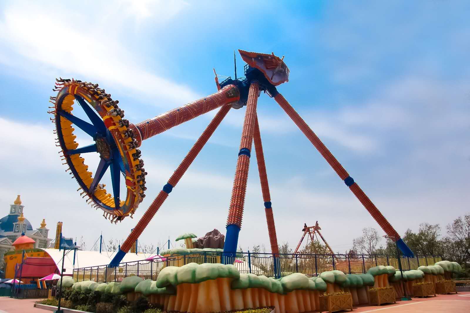 狹長的軌道扭曲360°后形成圓環(huán)、優(yōu)雅神秘,暴風(fēng)一般的速度轉(zhuǎn)體720°后半空驟停、急速倒退,創(chuàng)造出瘋狂刺激的風(fēng)中旅程,圓環(huán)過山車——暴風(fēng)眼加入多種高空運動體驗元素,讓忐忑和刺激的感覺交織沖擊您的極限!