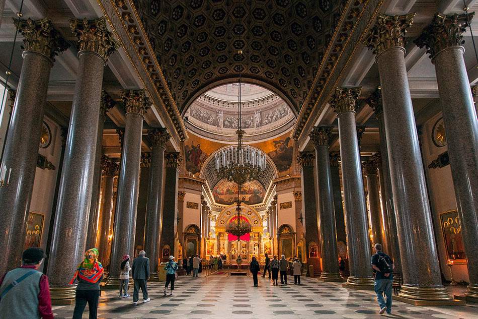 建筑師在設計這座教堂時遇到不少困難。根據東正教教規(guī)要求圣堂必須面向東方,因而必然造成教堂往往是側面對著主要大街。建筑師們采取了把側面設計得十分壯觀的方法解決了這一難題。版權所有山東聊城聊之旅國際旅行社有限公司,轉載必究!因為人們一看氣度非凡的柱廊,就忘記了這不是教堂的正面。這種處理方法極其大膽,富有特色。高大的圓頂居中聳立在一排排圓柱上空,圓頂有70米高。大教堂正面的浮雕、北面柱廊上的雕刻、殿內裝飾和油畫均出自名家之手。喀山大教堂的內部不大像一般的教堂,而更像一座宮殿。它明亮、輕快,以柱列分隔的長形主堂高大寬敞,中央穹頂輝煌華麗,仰視可見一幅圣母圖,周邊飾以圣經人物雕刻和水彩壁畫。