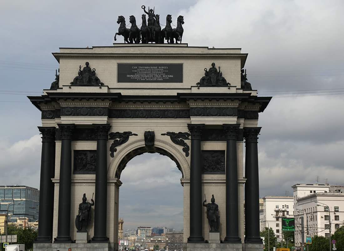 勝利廣場的東面,就是莫斯科的凱旋門,無論從藝術角度,還是紀念意義上來講,莫斯科凱旋門與法國巴黎的凱旋門都不相上下,兩者風格各異,卻同是藝術珍品。莫斯科凱旋門是為紀念俄國1812年的衛國戰爭而建。莫斯科凱旋門高達28米,摒棄了復雜的裝飾,門身上并沒有華麗的裝飾,只是在門頂立有一尊背有雙翅的勝利女神手執月桂花環,乘著六馬戰車向前行駛的雕塑;在女神像的下層,是幾位武士的雕塑,生龍活虎的武士有的手持利劍,有的高舉橄欖枝,還有的手捧月桂花環,每一個人的表情都生動細致;版權所有山東聊城聊之旅國際旅行社有限公司,轉載必究!武士雕塑再往下便是底層的深色高柱,高柱之間分列著四尊俄軍士兵的雕塑,士兵表情嚴肅,身著古時盔甲,執槍持盾,在他們的手指上還刻有“驅逐法西斯,解放莫斯科”的字樣,氣勢雄偉,古典大方。