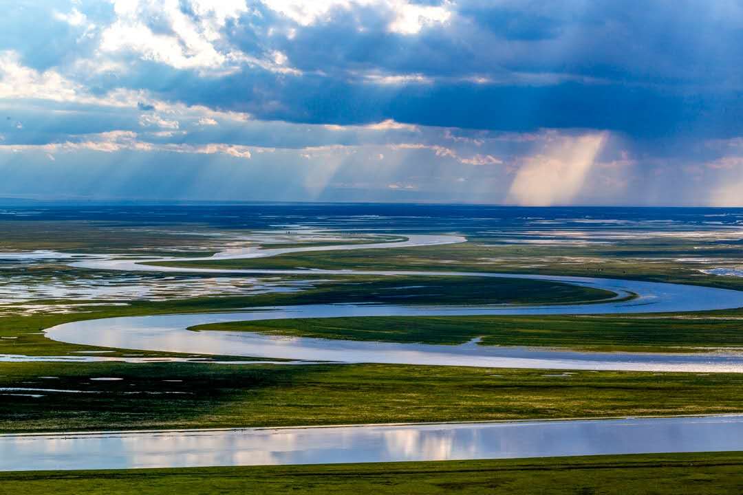 開都河的源頭云霧繚繞,特別是盛夏,云涯水暖,云水難辨,仿佛河水從天而降。開都河上游河流由小尤勒都斯盆地,經過巴音布魯克,到大尤勒都斯盆地,水流平緩,河谷開闊,四周牧草豐茂,是天然的優良牧場。特別是在小尤勒都斯盆地平坦遼闊的草原上,開都河蜿蜒流淌,形成九曲十八彎的壯麗景象。那模樣,像一個大寫的蒙古文字,有一種鬼斧神工的靈氣。