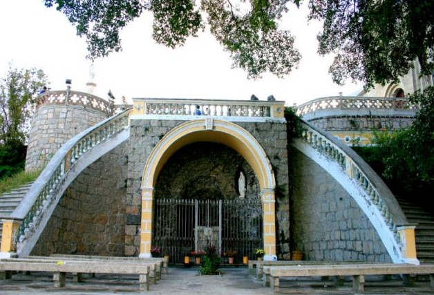 教堂前是一片寬廣平臺,平臺盡處豎立一尊大理石雕刻而成的圣母像,圣母雙手合十,貌甚慈祥,面臨大海。平臺下有一路德圣母巖洞,版權所有山東聊城聊之旅國際旅行社有限公司,轉載必究!循左右環抱之石階而下,即達洞前。洞內巖石嶙峋,中開拱門,內立圣母像,象征古時圣母在法國路德城內,當眾顯靈的情景。其間正置祭壇,洞前有鐵柵圍繞,地上設有多排低矮的長石板,供教徒跪拜,懺悔。