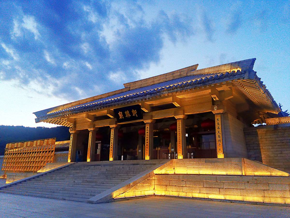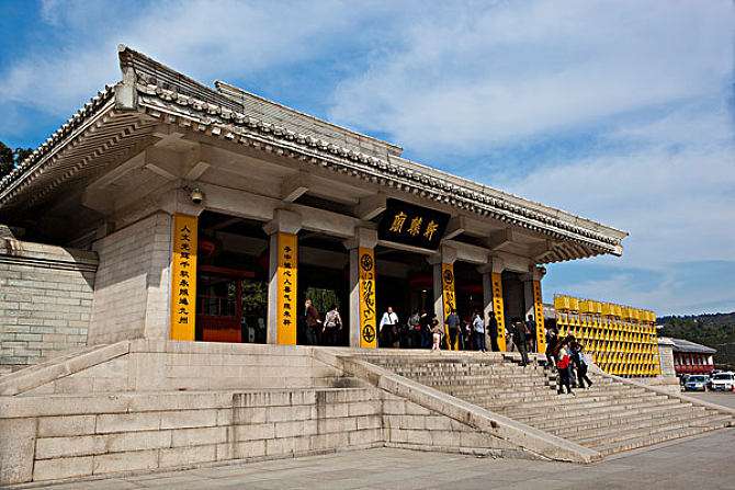 前檐當間建有六扇隔扇門,次間、稍間則各有四扇隔扇門。檐下的闌額、平板枋為和璽彩繪、斗拱彩繪,以及兩側(cè)與兩側(cè)背面、內(nèi)梁等處彩繪,均精致華麗,絢爛無比。大殿氣勢雄偉。正殿門楣上懸掛有原國民黨愛國將領(lǐng)程潛于1938年祭陵時所題“人文初祖”四字大匾。字體鐵畫銀鉤,剛中藏秀。大殿正中木質(zhì)壁龕內(nèi)供放著一尊軒轅黃帝全身浮雕像。這尊中華民族人文始祖的浮雕像,是以東漢武梁祠的畫像石刻拓片為藍本,經(jīng)國家文物局批準,放大刻制而成。版權(quán)所有山東聊城聊之旅國際旅行社有限公司,轉(zhuǎn)載必究!黃帝浮雕像,石料采用陜西富平墨玉,高3.9米,寬3.3米,重11噸。石浮雕像沉穩(wěn)站立,抬臂揚手,顯軒轅黃帝雄才大略之氣概;雕像冠帶簡樸,著裝無華,顯示出遠古之神韻。神龕四周的圖案為:上朱雀,下玄武,左青龍,右白虎。神龕與軒轅黃帝浮雕像都是香港同胞湛兆霖、程萬琦于1987年清明節(jié)專程前來祭陵時,捐款8萬元人民幣制作的。殿內(nèi)兩壁原有壁畫,繪軒轅黃帝一生的功德,后毀于明代。現(xiàn)大殿神龕周圍放置有花籃。神龕前供桌上有祭器、祭品等。殿外左右及背后有磚砌花墻。大殿前月臺寬21.1米,進深10.84米,置有香爐、香案。月臺前有臺階通道三處,中間臺階正中為一圓形二龍戲珠石雕。正殿前柱子上,書有一副楹聯(lián):“祖功澤百世,宗德潤千秋。”