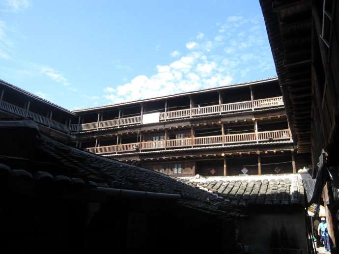 高北土樓群成員之一世澤樓,坐落在西北部,承啟樓東側,為長方形土樓,建于明嘉靖四十四年(1565),坐北朝南,占地約5100平方米。高4層。寬40.8米,11開間;長41.2米,12開間。
