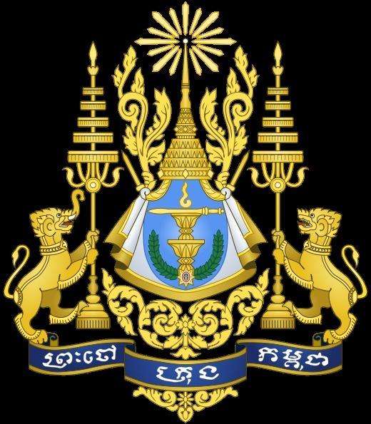 柬埔寨國徽的圖案是黃色的吳哥窟,上方有一個八角風車。以王劍為中心線兩邊對稱的圖案。菱形圖案中的王劍由托盤托舉,意為王權至高無上;兩側為由獅子守護著五層華蓋,五在柬埔寨風俗里象征完美、吉祥;兩邊的棕櫚樹葉象征勝利。底部的飾帶上寫著“柬埔寨王國之國王”。整個圖案象征柬埔寨王國在國王的領導下,是一個統一、完整、團結、幸福的國家。