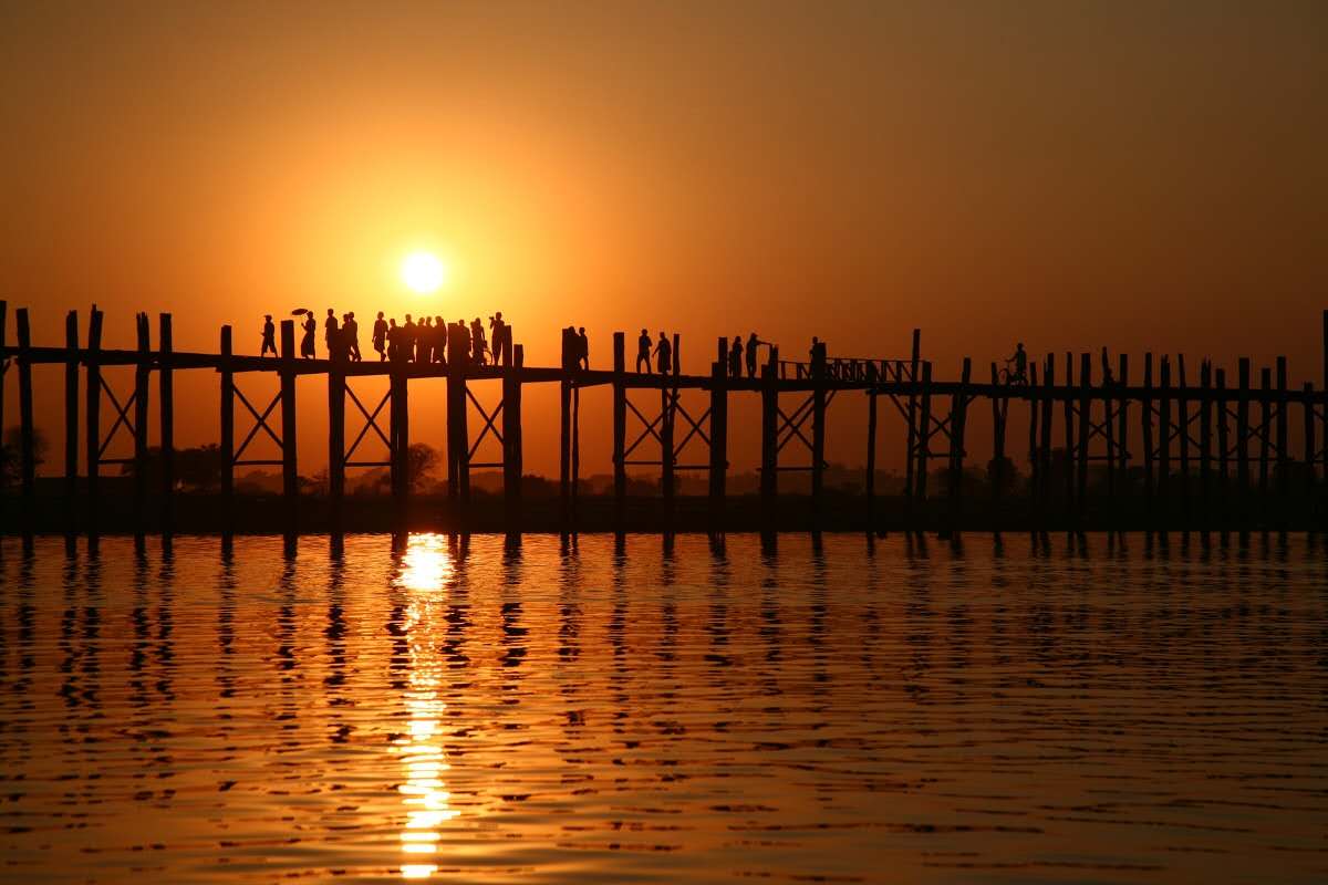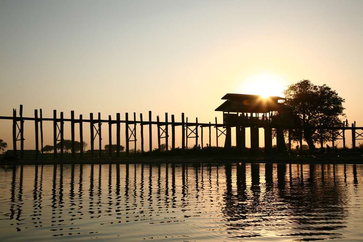 烏本橋建于1851年,長1200米,全橋完全由柚木鉚合而成,是世界上最古老和最長的柚木結(jié)構(gòu)橋。橋柱與橋柱之間相距3米遠(yuǎn),橋柱有1000多根。整座橋相接處沒有使用一顆鐵釘,全靠斗榫。這座橋已經(jīng)歷經(jīng)150年的風(fēng)風(fēng)雨雨,但是依然結(jié)實。