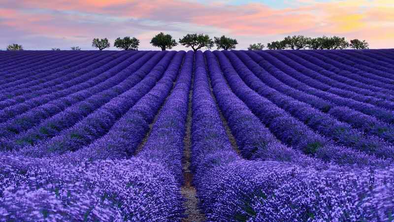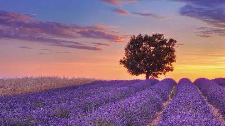 普羅旺斯暮色:夕陽與紅霞漫天散開,光影糅合大片花海,只能用震撼形容了!銀色、紫色、金色、綠色、紅色層次分明,勝似天上人間!