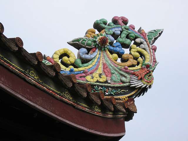 拜庭兩旁古榕參天,大雄寶殿雕塑技術(shù)高超,尤其是粱槽間的24尊飛天樂(lè)伎,在中國(guó)國(guó)內(nèi)古建筑中罕見(jiàn)。殿前月臺(tái)須彌座的72幅獅身人面青石浮雕,殿后廊的兩根古婆羅門教青石柱,同為明代修殿時(shí)從已毀的元代古印度教寺移來(lái)。大殿內(nèi)用近一百根海棠式巨型石柱支撐殿堂,俗稱"百柱殿",殿內(nèi)供奉的五方佛像,法相莊嚴(yán),是漢地少有的密宗軌制。大雄寶殿之后的甘露戒壇,系中國(guó)現(xiàn)存三大戒壇之一,壇之四周立柱斗拱和鋪?zhàn)鏖g的24尊木雕飛天。