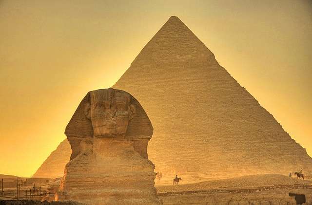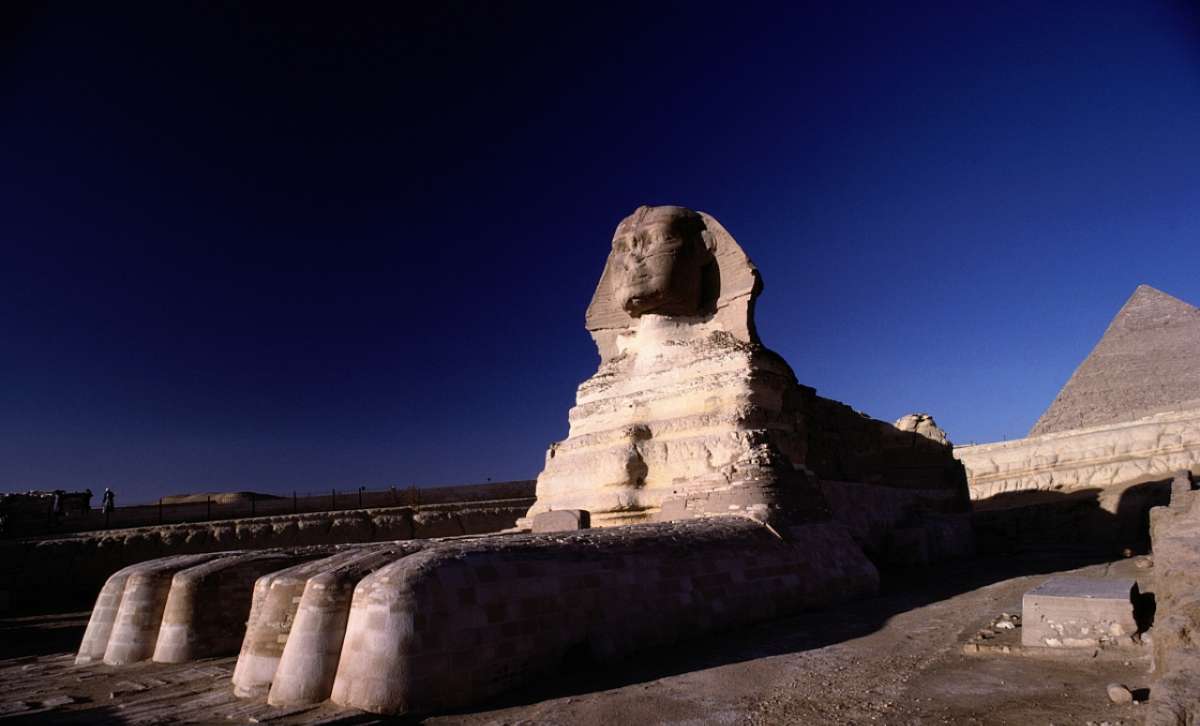 獅身人面像(又譯“斯芬克斯” sphinx)坐落在開羅西南的吉薩大金字塔近旁,是埃及著名古跡,與金字塔同為古埃及文明最有代表性的遺跡。像高21米,長57米,耳朵就有2米長。除了前伸達15米的獅爪是用大石塊鑲砌外,整座像是在一塊含有貝殼之類雜質的巨石上雕成。面部是古埃及第四王朝法老(即國王)哈夫拉的臉型。相傳公元前 2611年,哈夫拉到此巡視自己的陵墓——哈夫拉金字塔工程時,吩咐為自己雕鑿石像。工匠別出心裁地雕鑿了一頭獅身,而以這位法老的面像作為獅子的頭。在古埃及,獅子是力量的象征,獅身人面像實際上是古埃及法老的寫照。雕像坐西向東,蹲伏在哈夫拉的陵墓旁。由于它狀如希臘神話中的人面怪物斯芬克斯,西方人因此以“斯芬克斯”稱呼它。