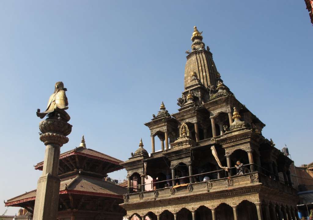 傳說這座廟的名字就是尼泊爾名字的由來,而這座廟宇也是杜巴廣場上最古老的建筑。在尼泊爾語中,加塔曼達表示“木頭建造的集會建筑”,所以這座廟又叫“獨木廟”。顧名思義,這座建筑建造初期的用途是供人們休息集會之用,后來改為廟宇,供奉哥拉納神。這座廟宇也非常熱鬧,每天一早,小販們就在廟門口擺滿了鮮花,出售給進廟祭祀的人們。