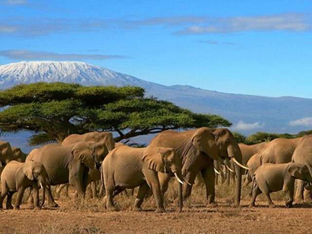 安波塞利國家公園(Amboseli Park)是非洲度假勝地之一,位于肯尼亞與坦桑尼亞交界地區,肯尼亞邊境,在這里可以清晰地看到海拔5895米的非洲第一高峰乞力馬扎羅山。接近赤道的乞力馬扎羅山頂終年覆蓋著積雪,山下莽原景色優美,安波塞利國家公園位于公園面積392平方公里,由于臨近云霧繚繞的非洲之巔——乞力馬扎羅山,吸引著一批批前來觀光的游客。安波塞利就是“干涸的湖”的意思。