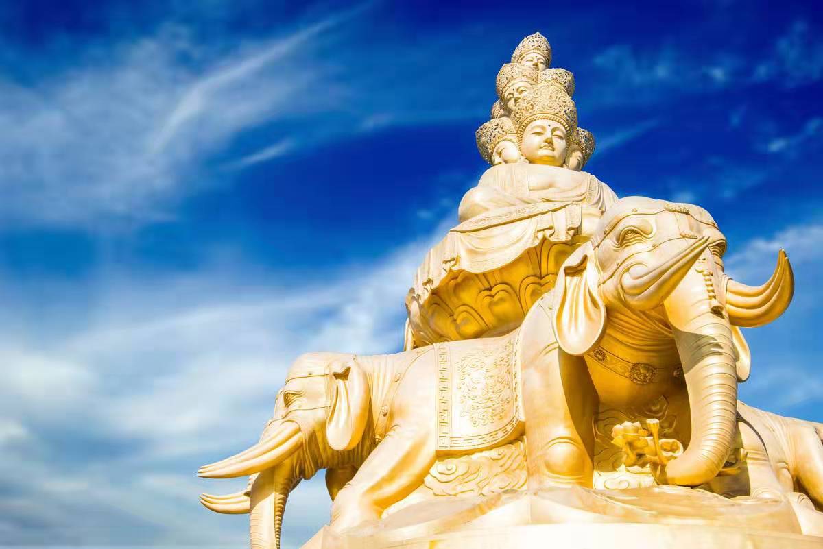 殿內供奉普賢騎象銅像,普賢端坐在蓮花臺上,手執如意,蓮臺置象背上,白象腳踏四朵蓮花。整個造像通體銅鑄,通高4.5米。殿內還有銅鼎等物。