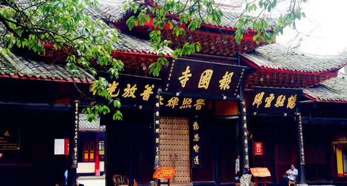 山門的“報(bào)國寺”大匾,是清康熙皇帝御題,王藩手書。正殿懸有“寶相莊嚴(yán)”匾。山門兩邊柱上那副對(duì)聯(lián)“鳳凰展翅朝金闕,鐘磬頻聞落玉階?!本褪菍?duì)報(bào)國寺這只“金鳳凰”周圍景物的生動(dòng)描寫。橫匾“普照禪林”和“普放光明”,同是一個(gè)意思:佛教稱峨眉山為“大光明山”,晝有神奇的佛光出現(xiàn),夜有萬盞圣燈來朝,全峨眉山都被光明普照。右邊“鶴駐云歸”,意為鶴停下了,云歸山岫,喻指清涼靜地,含有道家韻味。大門上的聯(lián)語:“獨(dú)思喻道,敷坐說經(jīng)。”前者是說靠自己的思維明白佛經(jīng)的道理,就是佛學(xué)講的“獨(dú)覺”境界。后句是說高僧大德鋪設(shè)好法座向弟子講經(jīng)說法。