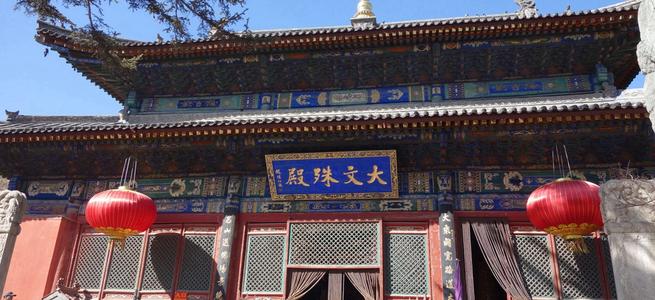 寺內最著名的建筑是文殊閣(大殿),現存殿宇為明弘治二年(1489)由鐵林果禪師主持修建的。大殿面寬五間,進深三間,重檐九脊歇山頂,是五臺山臺懷中心區(qū)最大的殿宇。殿內正中佛臺上供奉的文殊騎獅塑像,高近十米,是五臺山諸寺中最高大的一尊文殊塑像。