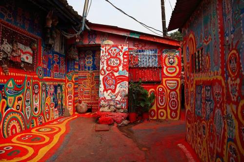 起源于住在臺中市南屯區(qū)嶺東科技大學(xué)附近有一處舊眷村的八十七歲老榮民黃永阜,因為「無聊」而拿起畫筆彩將眷村內(nèi)的巷弄街道當(dāng)成了天然的畫布,在上頭彩繪了各式美麗的彩虹線條與可愛動物,不僅染亮了小村,在網(wǎng)路上引起熱烈討論,更形成一股參訪風(fēng)潮。黃永阜先生86歲時開始作畫,他用自己手中的畫筆在眷村老舊的房屋和街道上勾勒出一個色彩斑斕的童話世界。老人最初只是在自家的屋里屋外用畫筆描繪心事,打發(fā)時光。后來不少鄰居被他充滿童真的畫所吸引,也邀請他去作畫,就這樣老人在無意中創(chuàng)造了一段色彩繽紛的傳奇。如今,他所居住的位于臺中市春安里的眷村被人們賦予了一個好聽的名字:“彩虹眷村”,并成為了當(dāng)?shù)氐臒衢T景點,每年吸引約50萬人前來參觀,而香港籍退伍老兵黃永阜則被人們親切地稱為“彩虹爺爺”。走進“彩虹眷村”,地面上、墻壁上畫滿了色彩艷麗、造型俏皮的兔子、小雞、猴子、小鳥、卡通人物、花朵、太陽以及彩虹等。紅色、黃色、藍色、綠色、白色,絢爛的色彩和極富想象力的線條,讓人們馬上置身于童話世界中。村口那條數(shù)十米長的巷道是“彩虹爺爺”作畫最多的地方,也是最熱鬧的地方。這里的畫色調(diào)明艷、熱烈,地上用油漆涂成了紅底,上面用白色和黃色等勾勒出小鳥、小雞和兔子等造型;墻上則分區(qū)塊時而以藍色為背景、時而以白色或黃色為背景,上面畫了數(shù)百卡通造型的猴子、貓和孩童。